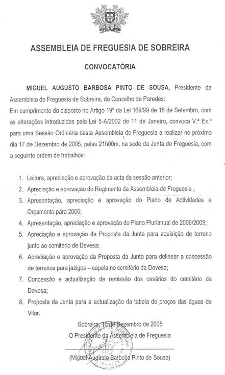 Realiza-se hoje às 21 horas, na sede da Junta de Freguesia da Sobreira, uma sessão ordinária da Assembleia de Freguesia. Clique em "Ler Mais" e fique a conhecer a ordem de trabalhos presente na Convocatória.