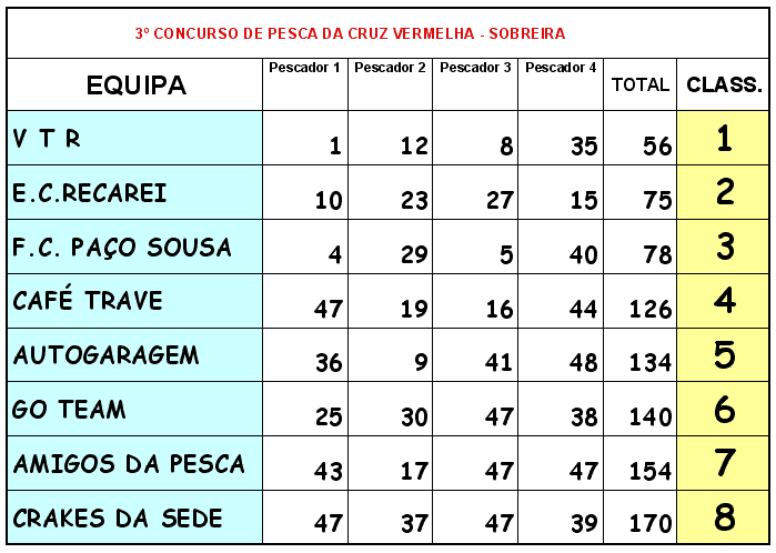 Já se encontra disponível no Sobreira.net a classificação individualizada e por equipas da 3ª edição do Concurso de Pesca da Cruz Vermelha. Embora não seja o mais importante nesta iniciativa, pode consultar a posição de cada participante clicando em Ler Mais.