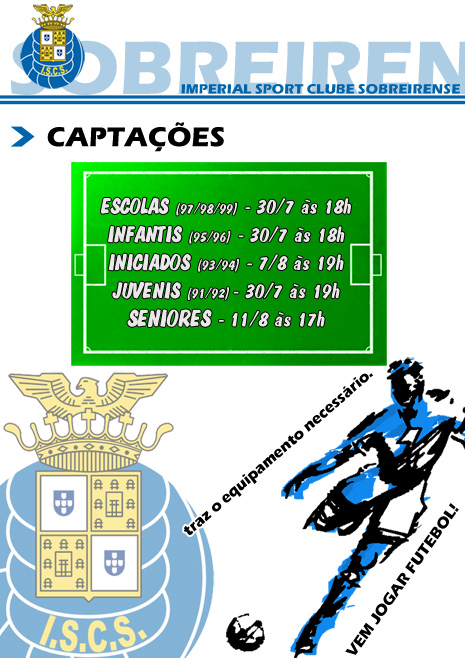 Como já havíamos adiantado o Imperial Sport Clube Sobreirense irá este ano inscrever 5 equipas: Escolas, Infantis, Iniciados, Juvenis e Seniores. Para proceder à formação das várias equipas serão realizadas captações de atletas para os diversos escalões. Clique em Ler Mais para ver o cartaz e saber quando se irão realizar.