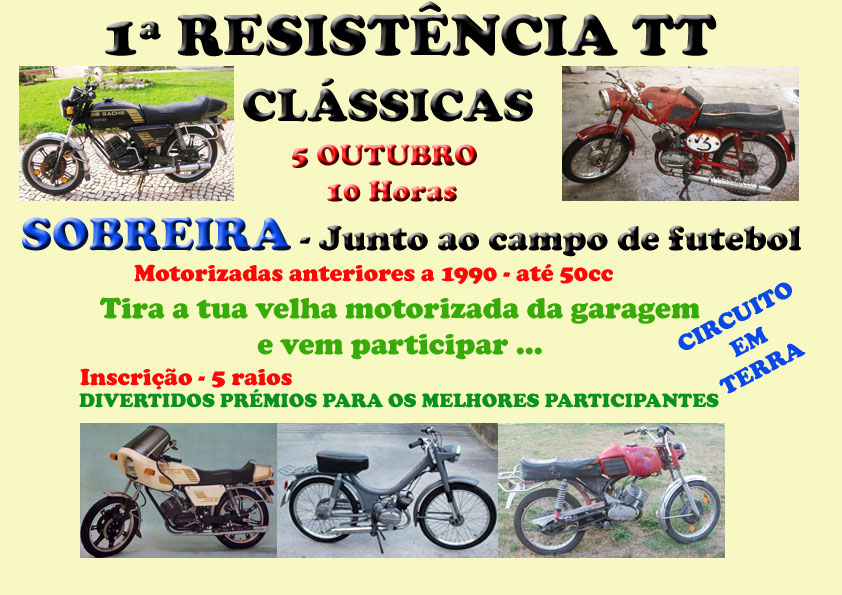 Vai decorrer durante o próximo dia 5 de Outubro, junto ao campo de futebol na Sobreira, a 1ª Resistência TT de motorizadas clássicas (anteriores a 1990 e com cilindrada máxima de 50cc).